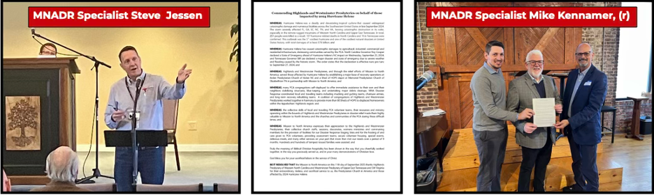 MNA Disaster Response Specialist Mike Kennamer presented the Resolution of Commendation to Westminster Presbytery at it’s Autumn meeting and MNA Disaster Response Specialist Steve Jessen presented the resolution to Highlands Presbytery at it’s Autumn meeting. This doesn’t happen very often which underscores the significance of the resolution. And, the work is continuning. You can read the resolution in it’s entirety here: https://tinyurl.com/bdf22tjh