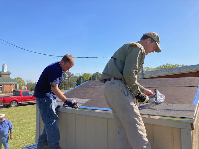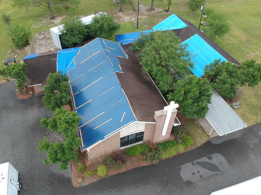 Sheds of Hope deployed shortly after the storms and so far six Sheds of Hope have gone to Lake Charles. Today, two additional SOH were constructed on the grounds of Bethel PCA to store church belongings while the church is being dried out and rebuilt. When Laura pounded Lake Charles, Bethel’s roof was significantly damaged. Some water entered the church in various spots after shingles were ripped off by the storm. MNA Disaster Response volunteers and church members blue-tarpped the roof until a replacement plan is settled on by the congregation.