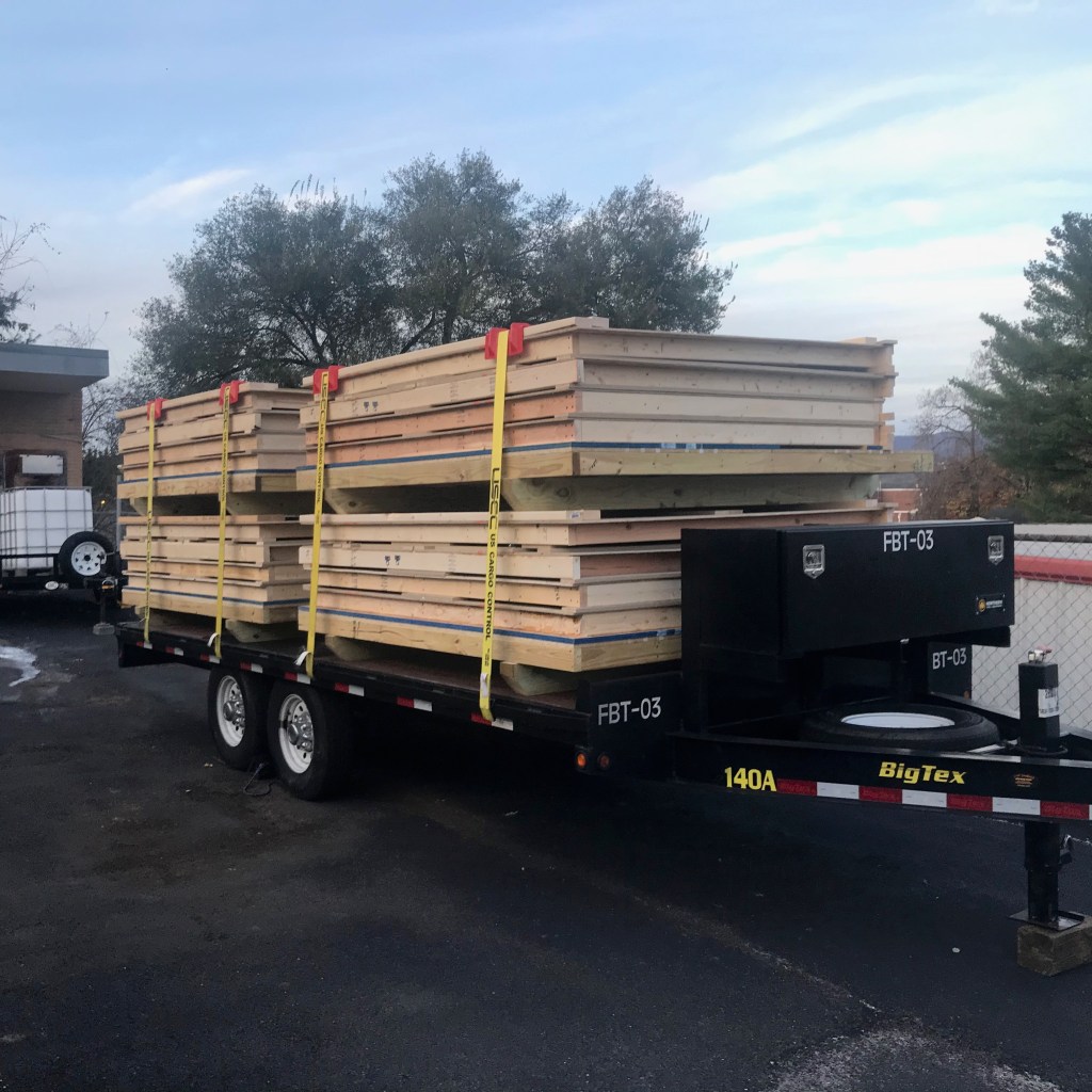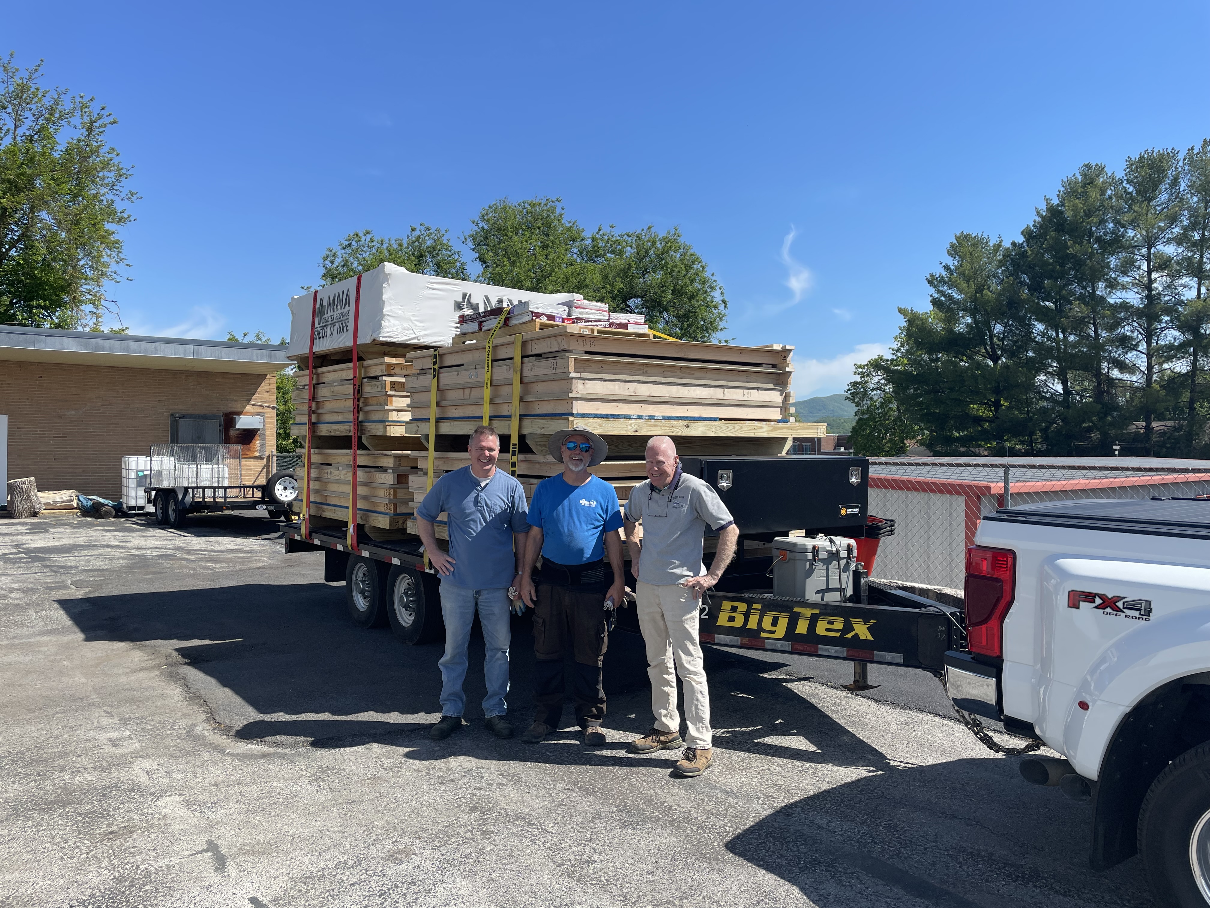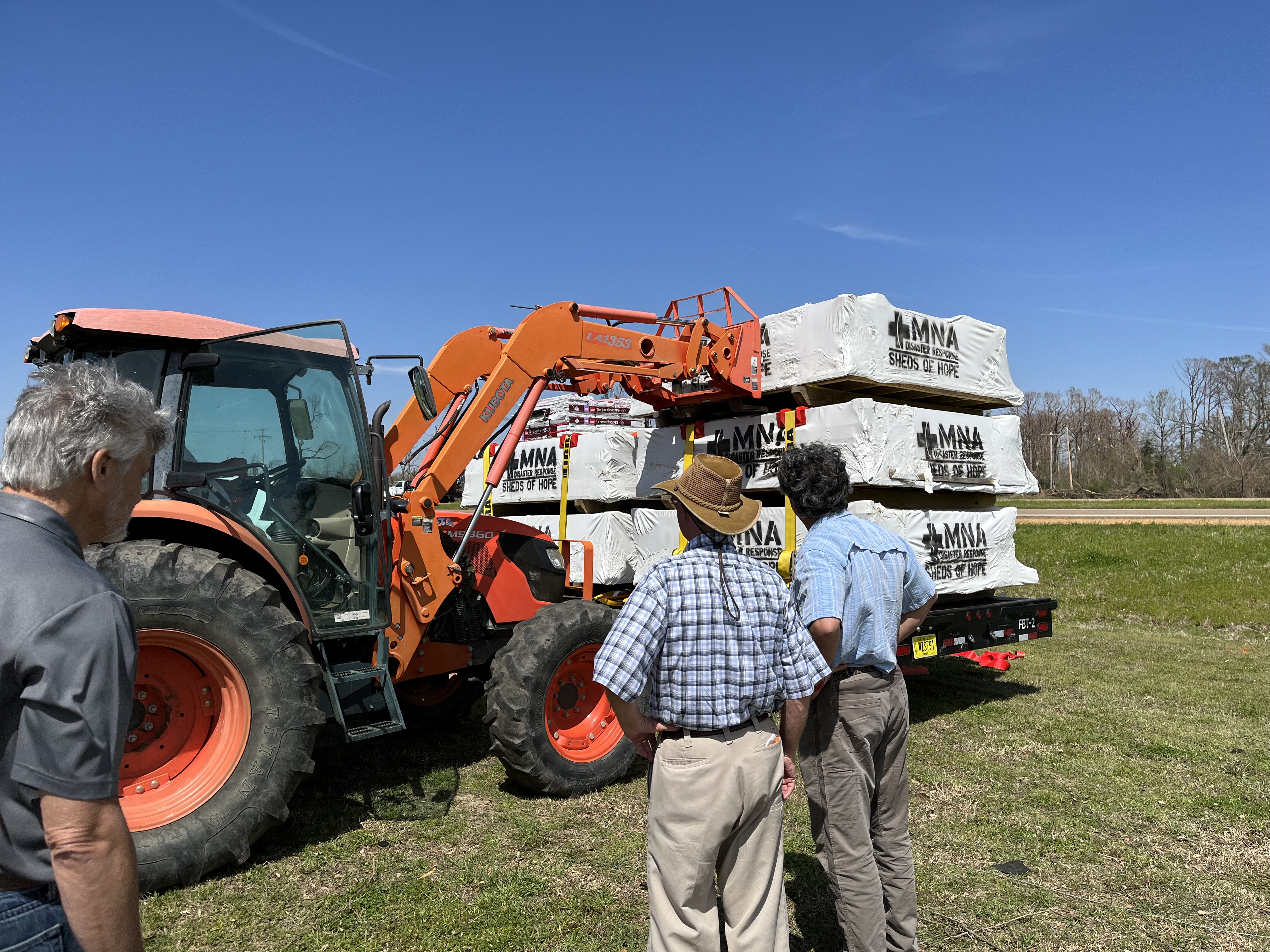 Each Sheds of HOPE kit weights about 1,500 lbs including shingles and the cinder-blocks that are used to support the shed when assembled on site. We normally transport 4 or 5 kits at a time, but when necessary we can transport 6 at a time. The combined weight of a trailer load of kits and the heavy-duty trailer is approximately 12,000 lbs total, but MNADR has the equipment to accomplish the task.