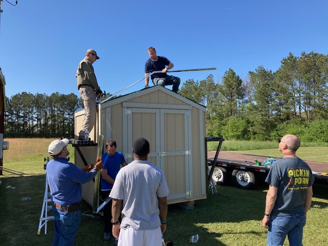 Plains Presbyterian Church of Zachary LA, near Baton Rouge showed up this week with two prebuilt Sheds of Hope to setup at the Bethel PCA recovery site, arduous work in sweltering conditions on a blacktop parking lot in 95* temperature. This is a typical operation that we are thankful for. These sheds will be used to provide secure worksite storage for valuable equipment and supplies that are used by our volunteer teams.