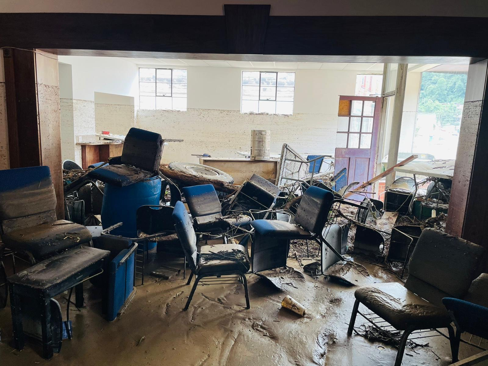 The church physical plant was inundated with 7+ feet of flood water and when the water receded the church was left with 6 to 8 inches of mud throughout the entire building. On August 3 MNA Disaster Response staff transported a ‘mud-out’ trailer and skid-steer loader to Neon to standup the OPC’s relief efforts. The mud-out trailer is a self-contained rolling equipment depot designed specifically for such work. It contains commercial grade pressure washers, large water holding tank, generators, dewatering pumps, portable lighting, dehumidifiers, blower fans, etc. The skid steer is being used to move debris and mud.