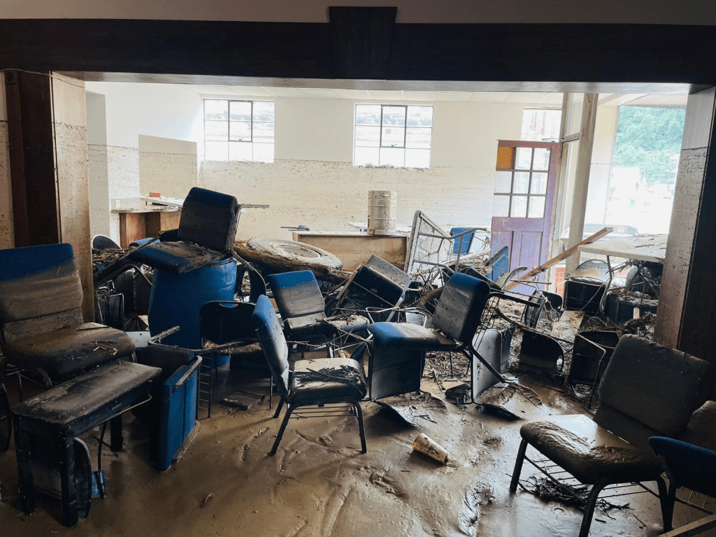 Fleming-Neon is a former coal mining town located in southeast Kentucky. In fact, the building occupied by the church still has a coal company sign over the back door. The main roads in town run alongside two seemingly innocuous creeks, that come together just south of the church building. On most days you could walk across the creek without any trouble. Anyone in town would tell you that these creeks often flood, but the water rarely rises above the sidewalk. But the flood that occurred the evening of July 28 was different. There were places in town where the water reached as high as 8 – 10 feet. Water levels in Pastor Jay’s church reached over 6 feet.