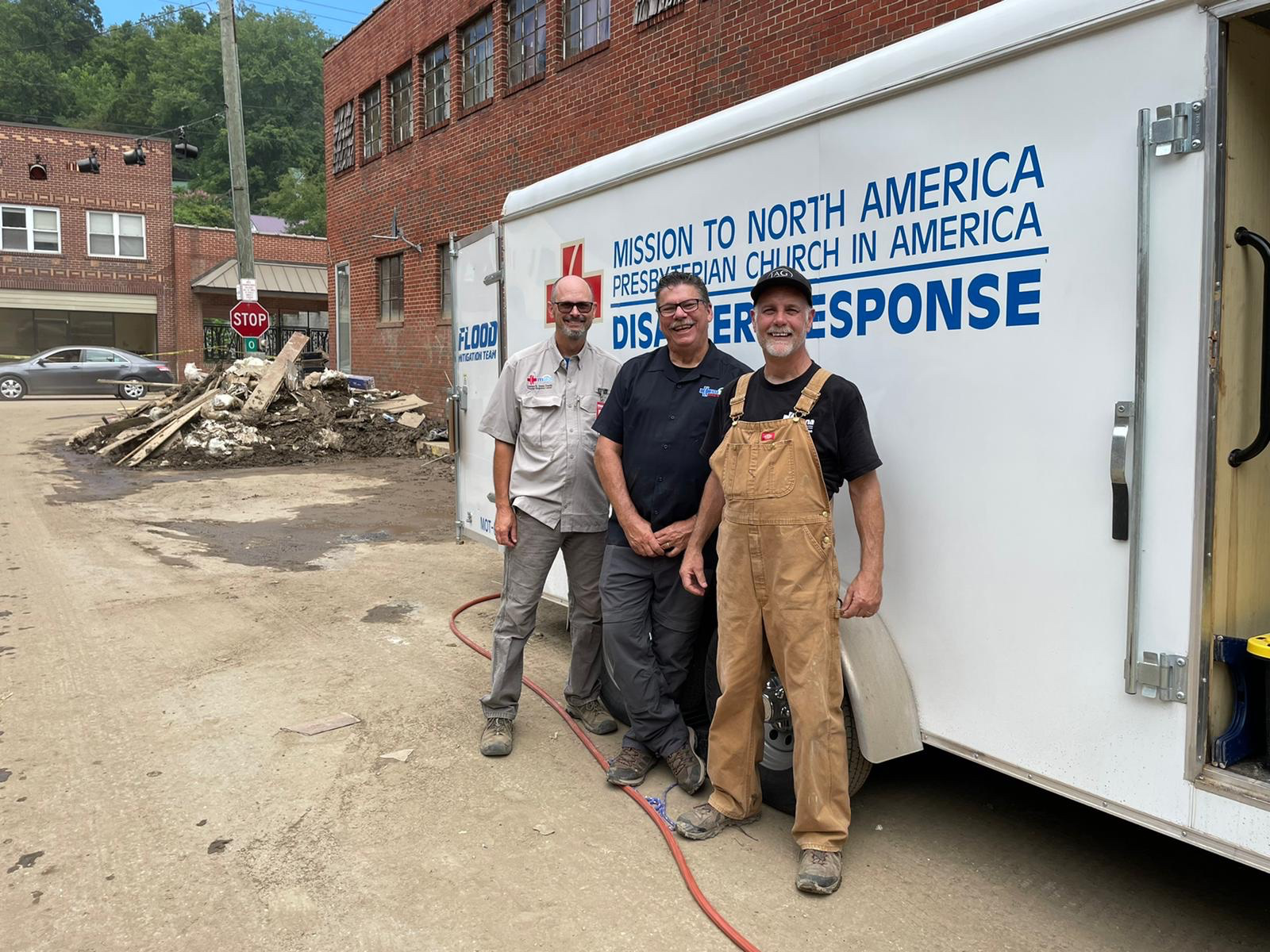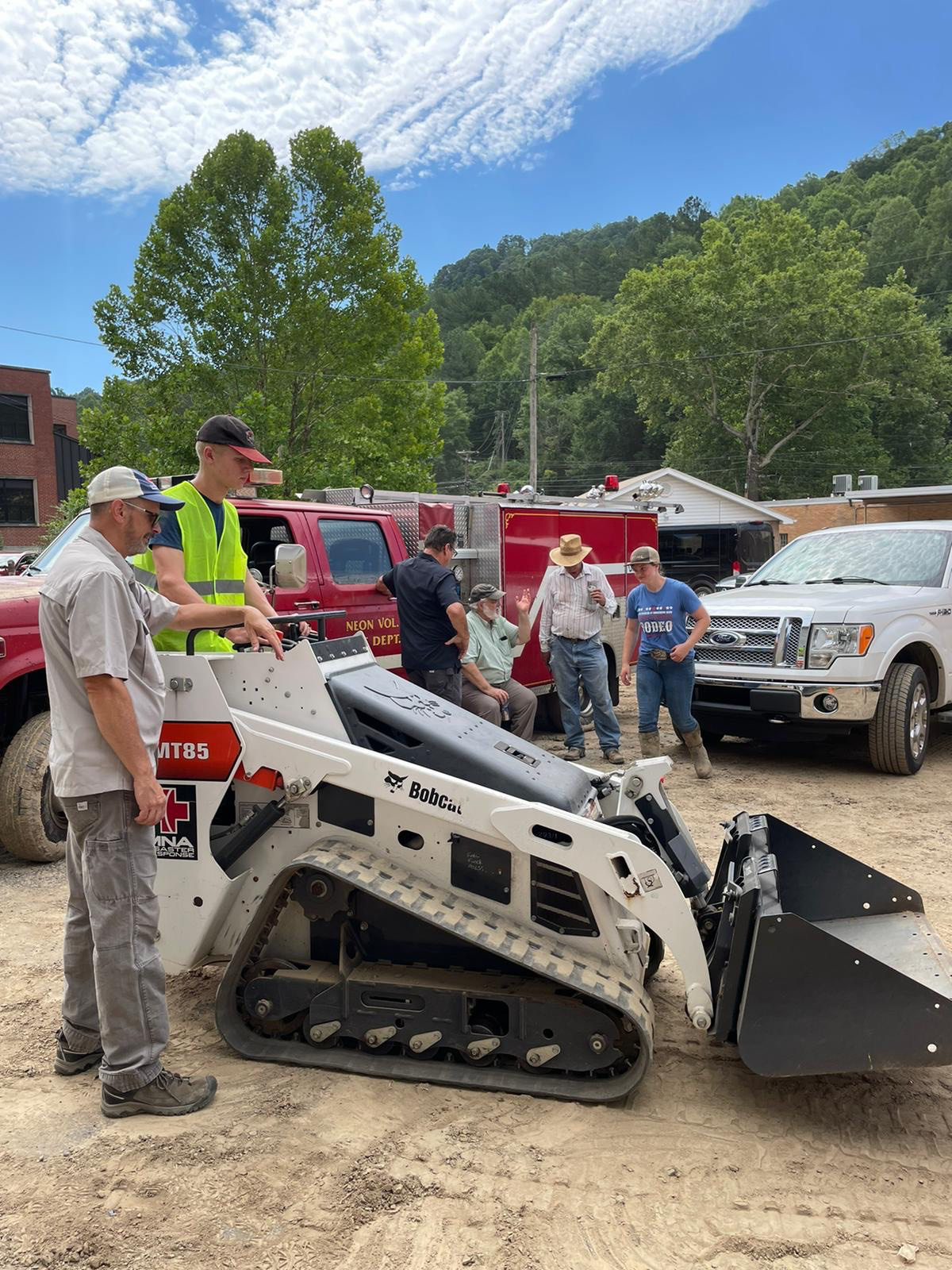 As the Orthodox Presbyterian Church’s (OPC) disaster response team began its work in Neon, MNA Disaster Response Director, Arklie Hooten, reached out to OPC Disaster Response Coordinator, David Nakhla, with offers to help in any way possible. On August 3, MNA Disaster Response sent three staff members, Arklie Hooten (Director), Marty Huddleston (Logistics Specialist), and Mike Kennamer (Warehouse Manager) to Neon to deliver a mud out trailer and a mini-track loader, along with a trailer and associated implements. Arklie Hooten trained local church members and volunteers to operated the mud out trailer, which includes pressure washers, water tanks, and other equipment for flood remediation. Mike Kennamer trained the local team to operate a Bobcat mini track loader and to safely change implements and load and unload from the trailer.