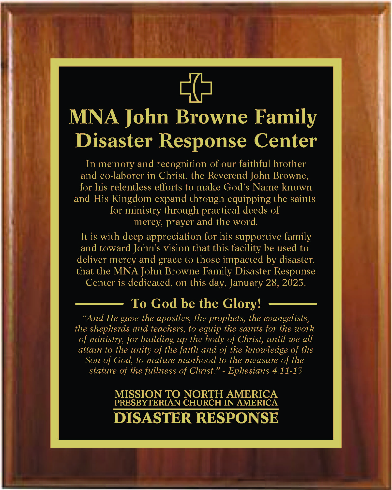 The service of dedication was faithful to recognize God’s continued blessing to MNA and remember John Browne’s huge contribution to these efforts. Arklie Hooten, MNA Disaster Response Director recounted that the cumulative reward of hard work by many of God’s people, over the long-haul, in the same direction, results in full harvest. Rick Lenz, the Depot Manger recognized all those who contributed the time, talent, and treasure to make the campus fully operational. Under his excellent leadership the depot’s inventory has grown to well over $1,000,000 of supplies, equipment and specialized mission-critical speciality trailers such as mobile bunkhouses and showers, skid-steer loaders, and huge generators capable of repowering church buildings when the power-grid gets knocked out.